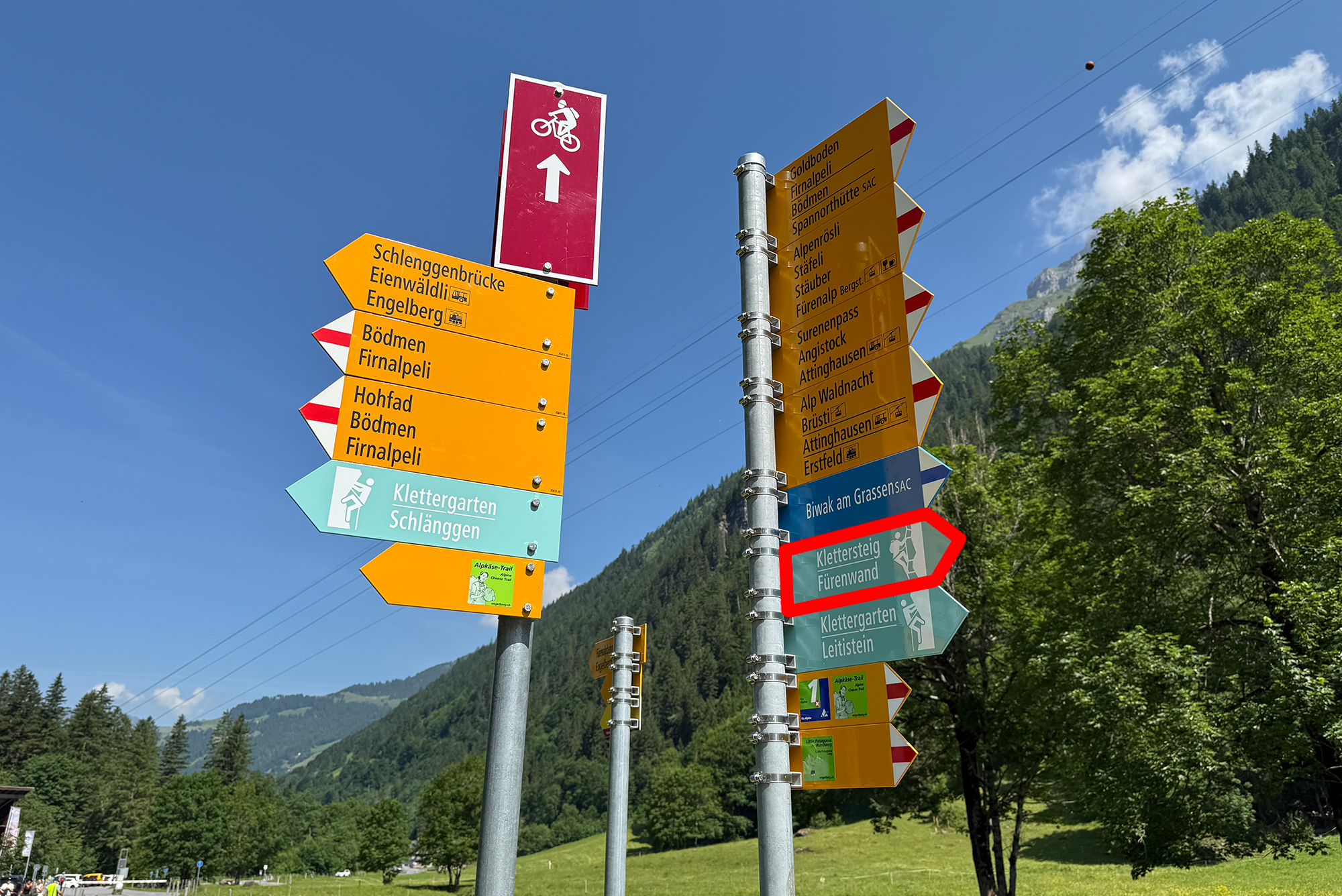 Depuis le village d’Engelberg, prenez la direction de la station Engelberg-Fürenalp Bahn. Stationnez sur le parking (payant), puis suivez la signalétique bleue claire « Klettersteig Fürenwand ». Comptez 20 à 30 minutes de marche jusqu’au départ de la via ferrata.