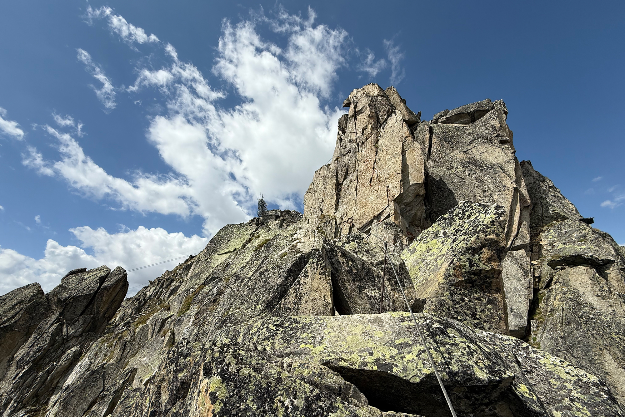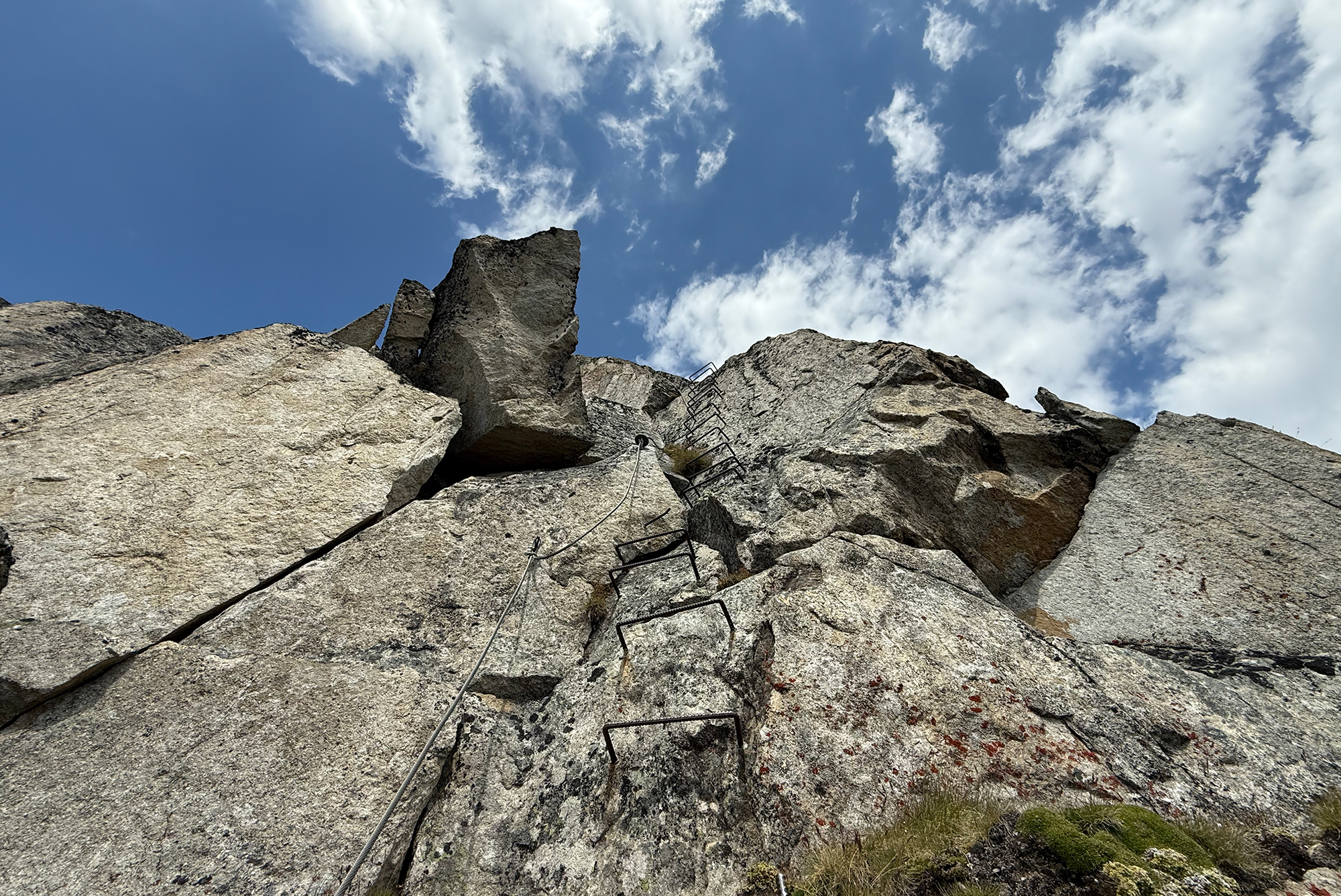 L’ascension se poursuit par plusieurs sections verticales en direction de gros amas rocheux.