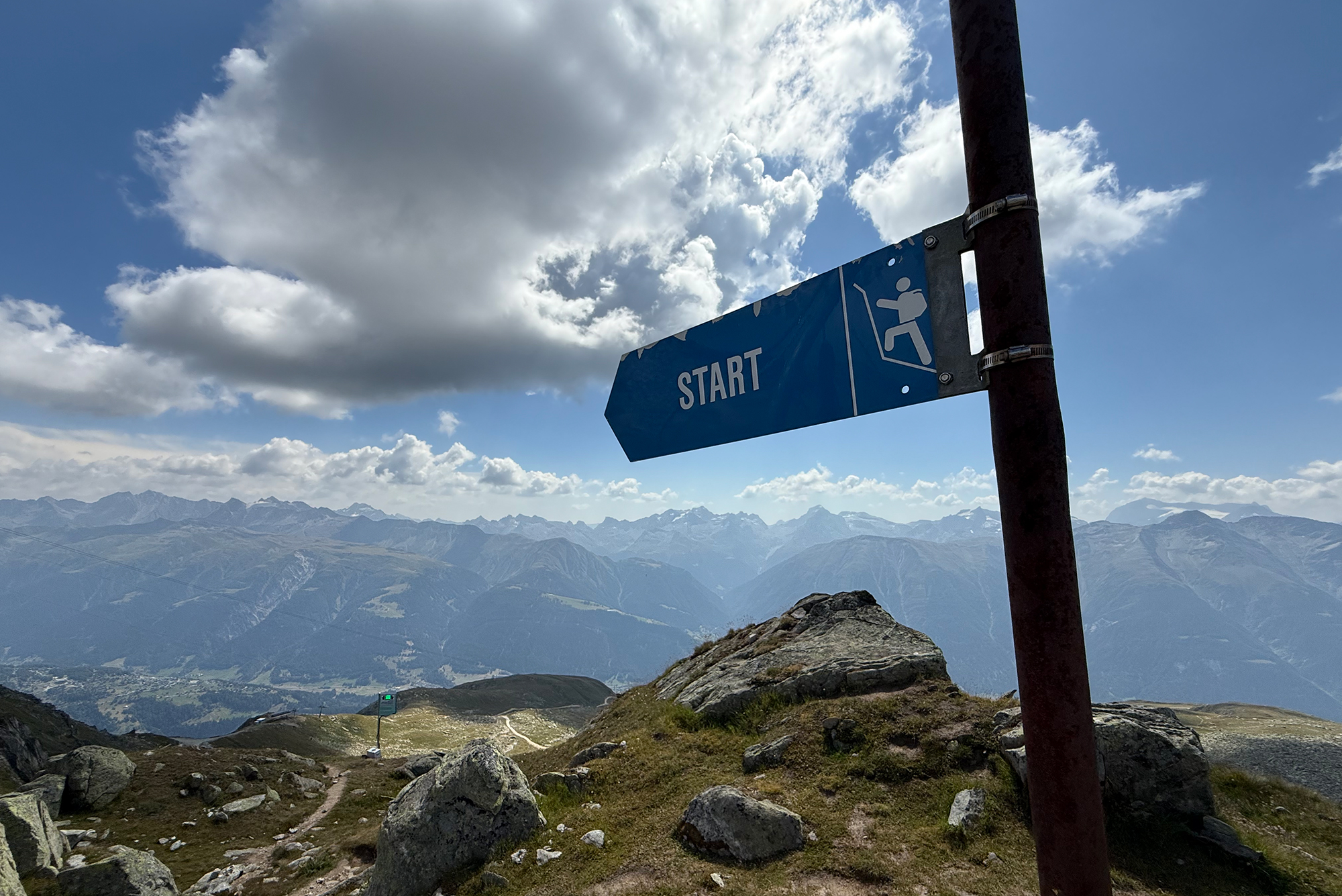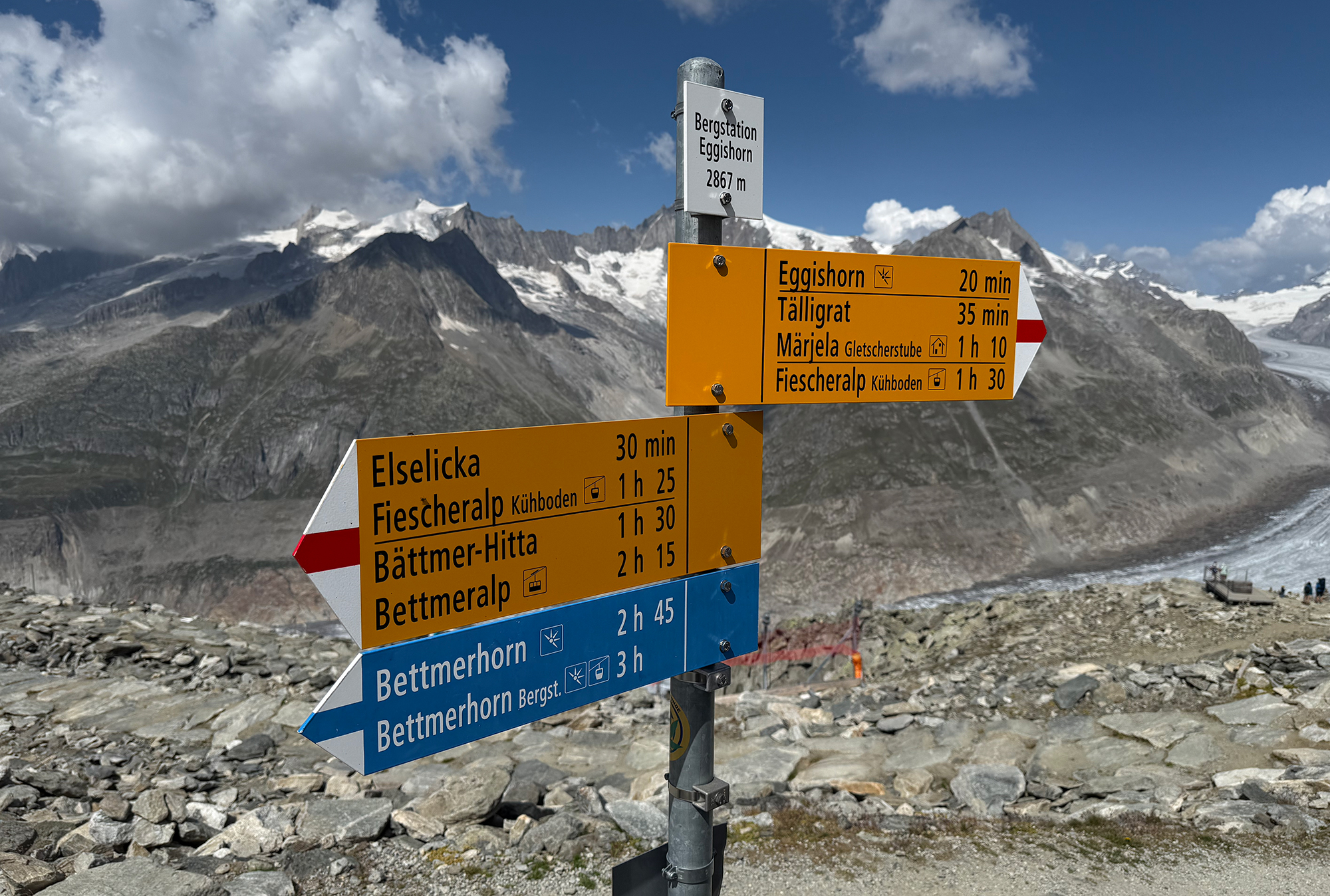 Pour rejoindre la station depuis l’arrivĂ©e de la via ferrata, suivez la signalĂ©tique bleue (peinture). Au sommet, une vue panoramique s’ouvre sur le glacier d’Aletsch.