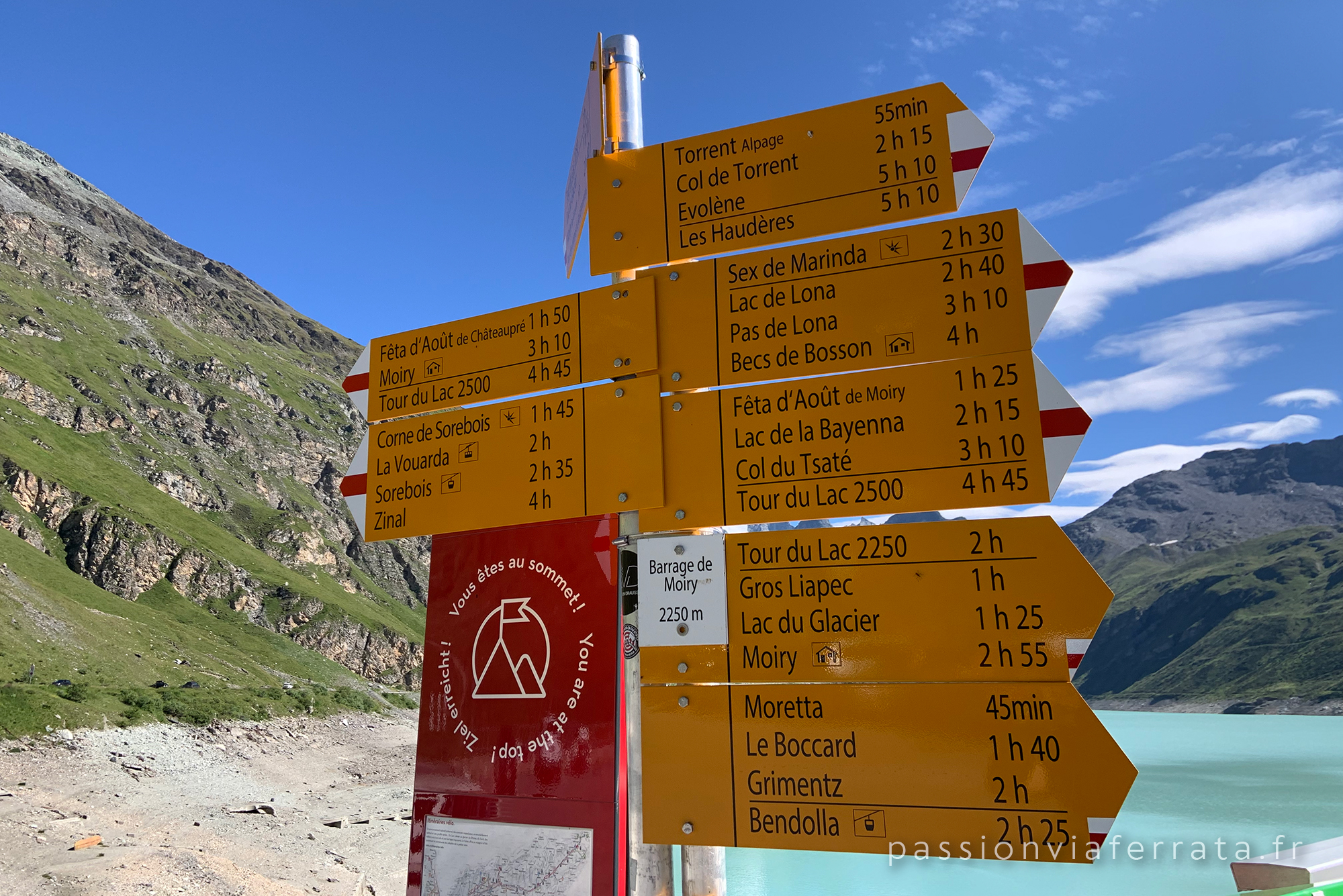 Prenez l’autoroute A9 jusqu’à Sierre puis la sortie 29 (Sierre-Est). Continuez en direction de Val d’Anniviers. Dans le village de Vissoie, prenez à droite sur “Route de Grimentz” puis continuez en direction de Grimentz. A la sortie de ce village, suivez “Route de Moiry” jusqu’au barrage. ⚠️ Attention, la route reliant Grimentz à la via ferrata de Moiry n’est accessible qu’en période estivale (mi-juin à fin octobre environ) et ce, lorsque les conditions météo le permettent.